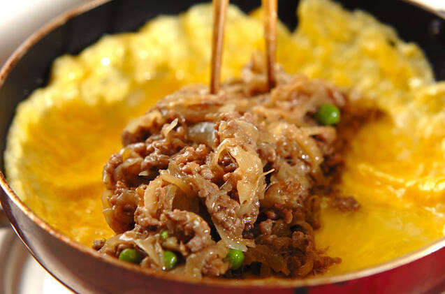 (2)の炒めた具の1/4量を縦にのせ、フライパンを左右どちらかに傾けて卵ごと滑らせ、手首を返しながら卵で具を包んで器に返す。キッチンペーパー等で形を整える。残り3回も同様に繰り返す。