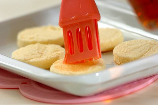 スポンジに<シロップ>をたっぷり染み込ませ、1枚ずつカップに敷き込み、<カスタード>の半量を絞り入れ、スライスしたイチゴを敷き詰める。