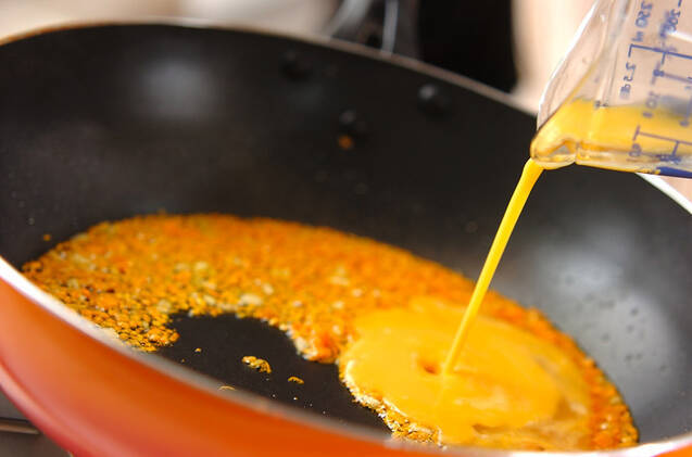 サッとキッチンペーパーなどで中華鍋を拭き、残りのサラダ油大さじ2、ニンニク、ショウガを加えて強火にかける。香りが立ってきたらニンジンを入れて炒め、溶き卵を一気に流し入れ、木ベラで混ぜる。