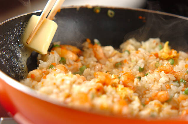 卵が半熟の状態でご飯を加え、からめるように炒め合わせ、全体にパラパラに混ざったら、(1)のエビとサヤインゲンを加える。塩コショウで味を調え、バターを鍋肌から溶かしながら全体に混ぜ合わせる。