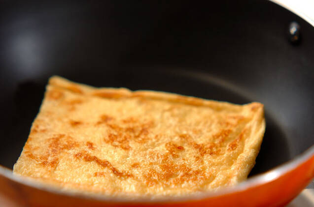油揚げはフライパンで両面に焼き色がつく位焼き、細切りにする。