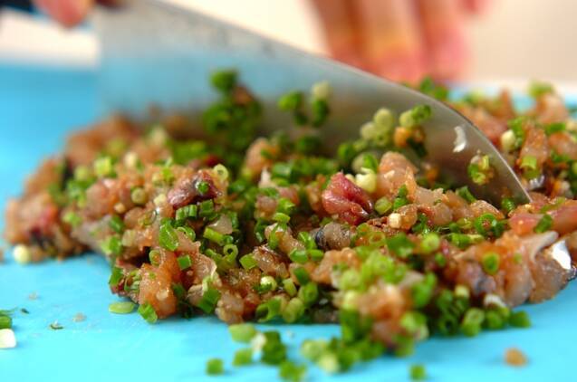 アジを幅5mmの削ぎ切りにし、包丁でたたくようにして刻みネギ、ニンニク、ショウガ、砂糖、みそを加えて合わせる。