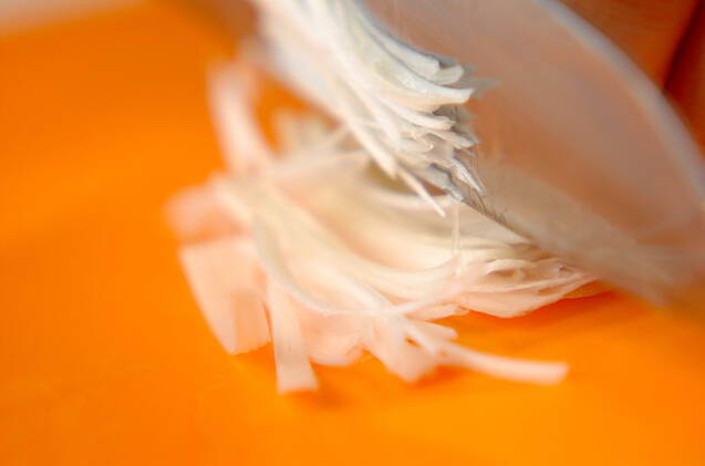 キュウリは、長さ5cmのせん切りにする。白ネギは長さ5cmの白髪ネギにして水にさらし、水気をよくきる。