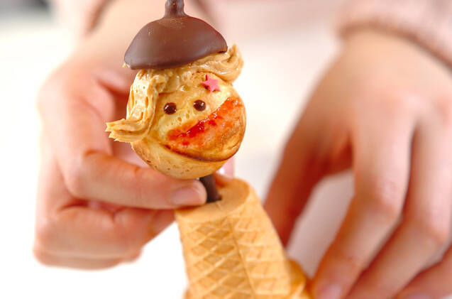 (1)と(2)にチョコレート菓子を刺し、逆さにしたコーンカップに刺して立たせる。