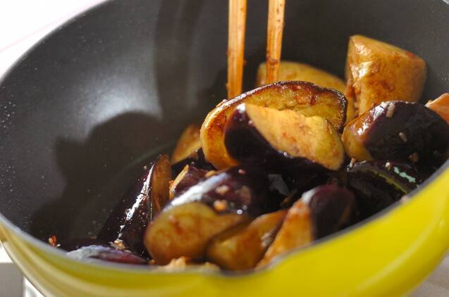 (2)に(1)を加え、ナスに火が通りしんなりするまで中火で炒め、食べやすい大きさに切ったサニーレタスをしいた器に盛る。