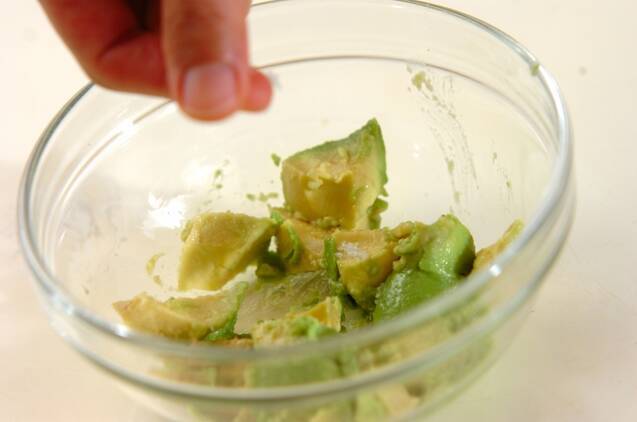アボカドは種を取り、スプーンで身を取り出して、食べやすい大きさに切り、塩を振る。