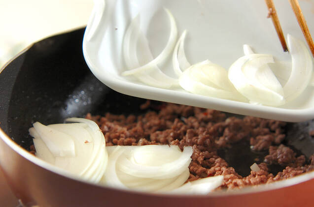 (1)のフライパンにサラダ油を熱し、ニンニク、赤唐辛子を入れ、香りがたったら合いびき肉を加える。合いびき肉の色が変わったら、玉ネギを加えて炒め合わせる。