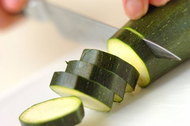 ズッキーニは厚さ1cmに切り、大きければ半月切りにする。ベーコンは幅7~8mmに切る。プチトマトはヘタを取り、横半分に切る。