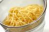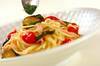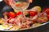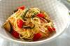ベーコンとプチトマトを加えて炒め合わせ、白ワインを加える。さらにスパゲティーを移し入れ、ゆで汁をお玉1杯分加えて強火で炒め合わせる。
