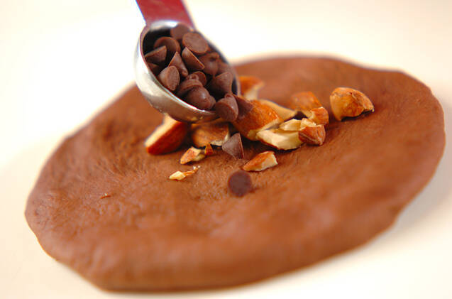 成形する。とじ目を上にして10cm程に広げ、6等分しておいたアーモンドとチョコチップを手前にのせて巻き込み、ドッグ型にする。さらに、20cmくらいの棒状に伸ばす。片方の先を細くし片方の先を太くしておく。太い方の先を軽く押して平たくし、丸い輪っか状にして細い方の先を包みこんで閉じる。ここできちんと閉じていないと、最終発酵後ゆでる時につなぎ目がとれてしまうので注意。