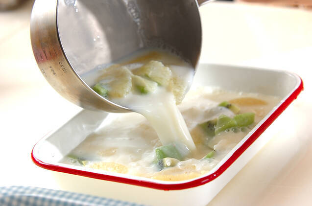 容器の内側を水でぬらし、3をフルーツごと移し入れ、冷蔵庫で冷やし固める。お好みの大きさに切り分けて器に盛る。