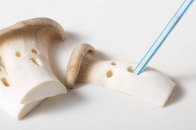 エリンギは5mm幅のスライスにしストローで目と口を抜くと、おばけエリンギになる。
