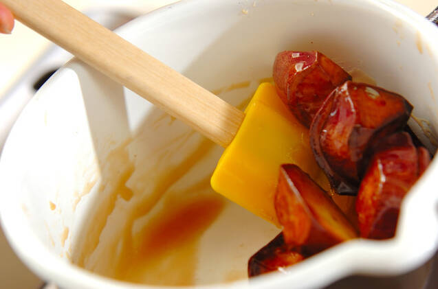 サツマイモに薄く揚げ色がついて竹串がスッとささる位まで揚げ、(2)の鍋に入れて全体に<みつ>をからめる。クッキングシートなどの上に広げ、黒ゴマを振る。冷めたら器に盛り分ける。