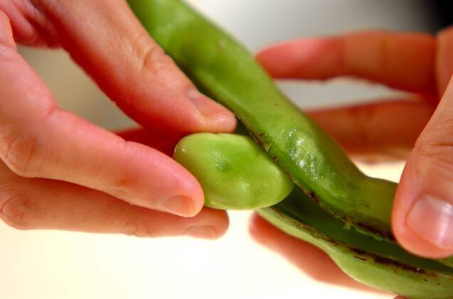卵は、溶きほぐす。ソラ豆はサヤから出し、分量外の塩を入れた熱湯で1分位ゆで、水に取って薄皮をむく。貝われ菜は、根を切り落とし、サッと水を通して種を取る。ショウガとニンニクは、皮をむいてみじん切りにする。