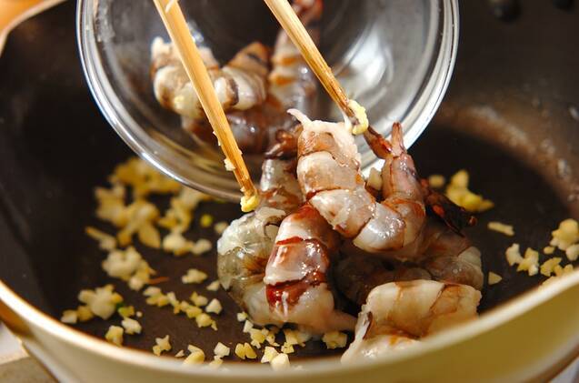 (1)のフライパンにニンニク、ショウガを入れて炒め、香りがたってきたらエビを加えて炒める。