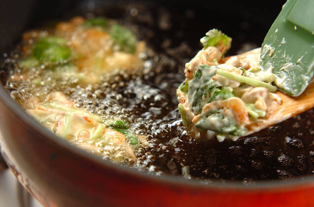 (2)をひとくち大ずつ木ベラにのせ、170℃の揚げ油でサックリ揚げる。