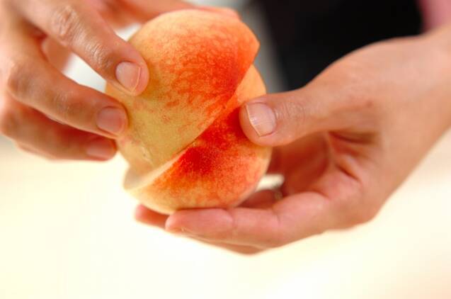 桃は種まで切り込みを入れ、両手で挟み込んでゆっくり少しずつ回転させて2つに分け、種を外して皮をむく。1/2個は1cm角に切ってザルに上げ、果汁は残しておく。残り1個は乱切りにする。