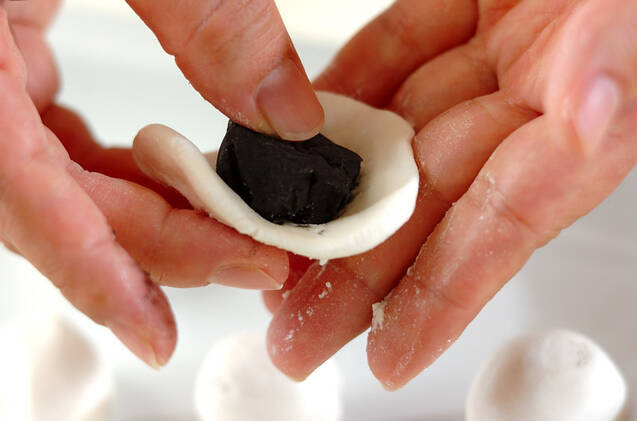 ボウルに白玉粉と水を入れ、ひとまとめにする。8等分して(2)の<黒ゴマあん>を包む。熱湯でゆでて氷水に取り、よく冷やす。