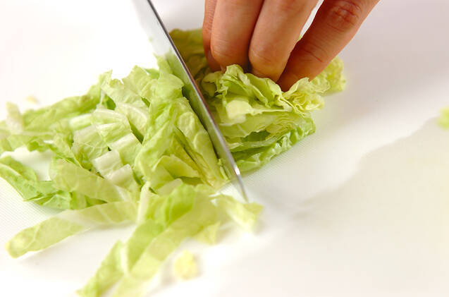 白菜の葉は細切りにして水洗いしザルに上げる。