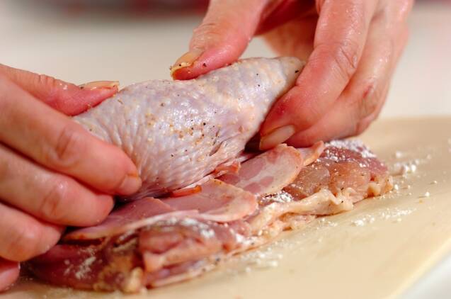 鶏もも肉は常温にもどし、余分な脂肪を切り取り、両面に塩コショウし、軽く小麦粉を振る。ベーコンを広げ、端から巻き込んで棒状にし、タコ糸でしばる。