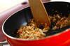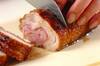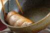 赤ワインを加えて蓋をし、6~7分蒸し焼きにする。竹串を刺して透明な肉汁が出てくればよい。アルミホイルに包み、温かい場所で保温する。