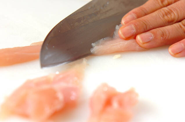 鶏ささ身の厚みを半分にし、削ぎ切りにする。