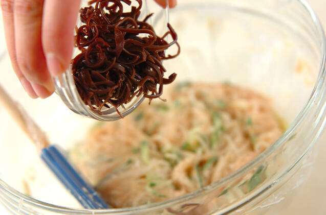 <タラコマヨネーズ>のボウルに、春雨、キュウリ、キクラゲを加えてよく混ぜ、器に盛る。