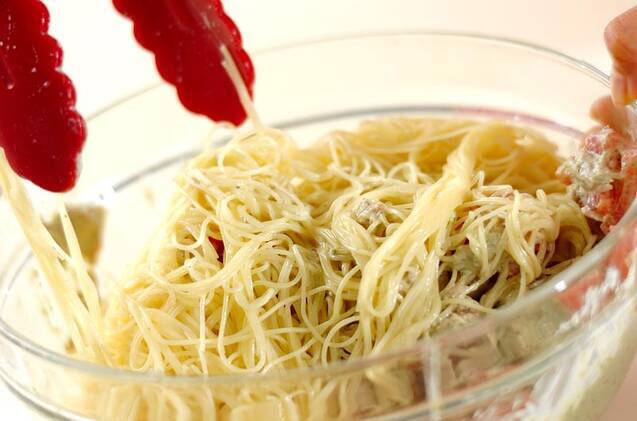 (1)に(2)のスパゲティを加えて和え、器に盛り、ブラックオリーブを散らす。