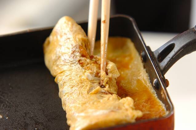 サラダ油を全体に薄くひき、残りの卵液の半量を流し入れ、巻いた卵を菜ばしで持ち上げ、その下にも卵液を流し込む。周りがかたまって半熟になったら向こうから手前に巻き、同じ様にもう1度くり返す。