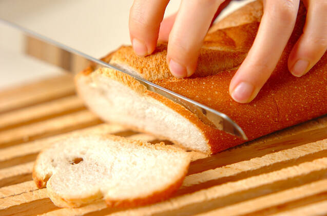 フランスパンは薄切りにしておく。オーブンを160℃に予熱する。