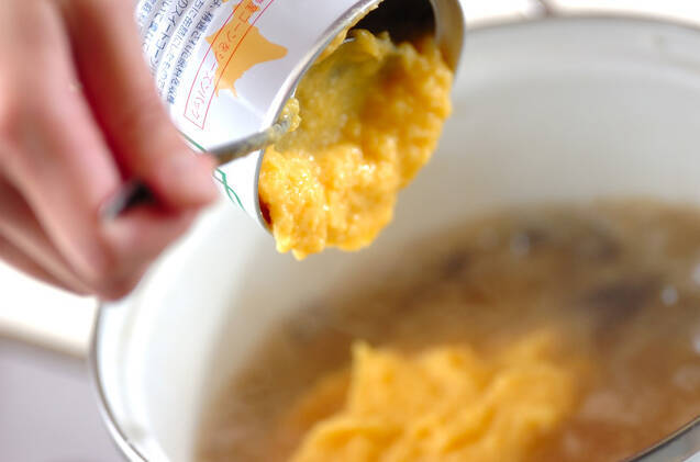 クリームコーンを加えて煮たったら火を止め、溶き卵、キヌサヤを入れてよくかき混ぜ、器に注ぎ分ける。