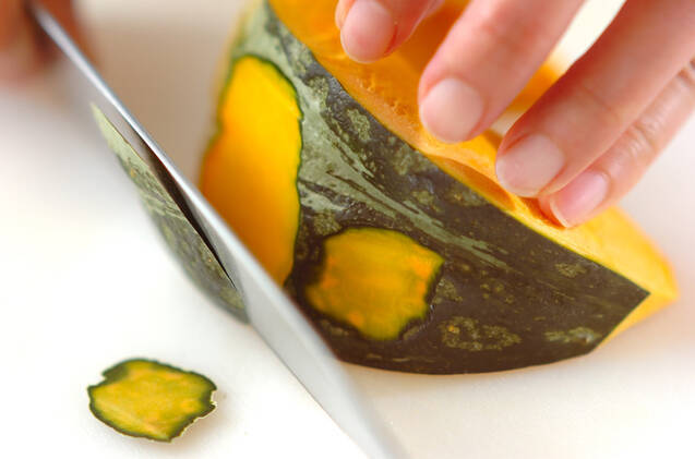 カボチャは種とワタを取って所々皮を削ぎ落とし、ひとくち大に切る。水に通して耐熱容器に並べ、ラップをかけて電子レンジで2分加熱してそのままおいておく。玉ネギは縦薄切りに、シメジは石づきを切り落として小房に分ける。サヤインゲンは軸側を少し切り落とし、長さを2~3等分に切る。