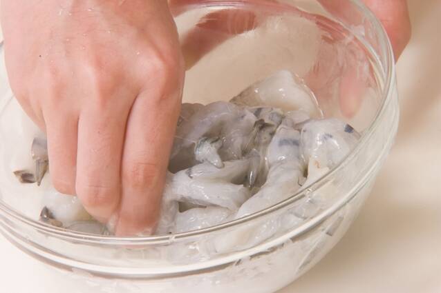 エビは殻をむき、背に切り込みを入れて背ワタを取り、塩水でサッと洗い、水気をきって、<エビの下味>をからめる。