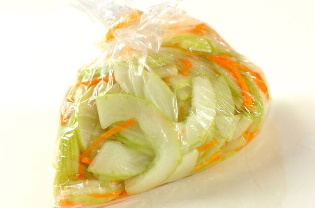 ビニール袋に白ウリ、ニンジン、塩を入れ、袋に空気を入れて口をしっかり持ち、袋を振って全体に塩をからめ、空気を抜いて口をしばり10分おく。