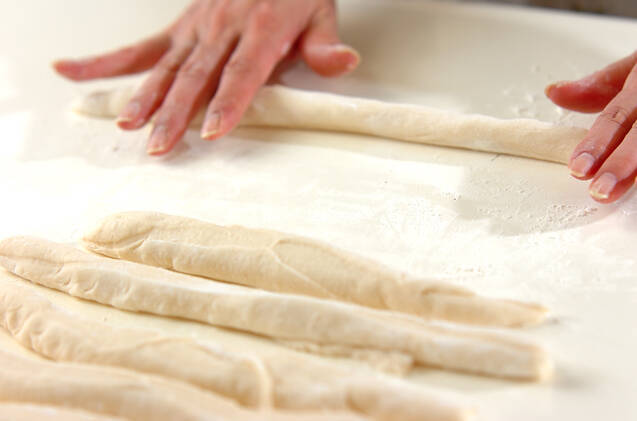 生地を台に取り出し、軽く手で押さえてガスを抜く。6等分に細長く切り、片方の端が少し細くなるように30cmくらいの棒状に伸ばす。コルネ型にサラダ油を薄くぬる。
