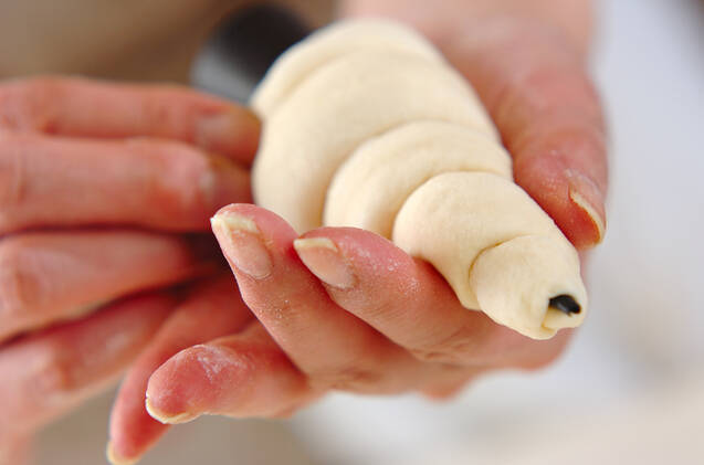 コルネの尖っている側から、あまり引っ張らないようにして少し隙間を空けるようにして巻きつけ、巻き終わりは少し押さえてくっつけ、巻き終わりを下にしてオーブンシートを敷いた天板に並べる。生地が乾かないようにラップをかけ、温かい所において2倍くらいになるまで二次発酵させる(約30分)。