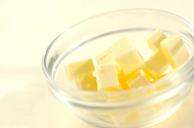 無塩バターは1cm角に切り、全ての材料を冷蔵庫で冷やしておく。天板にオーブンシートを敷く。オーブンは170℃に予熱する。