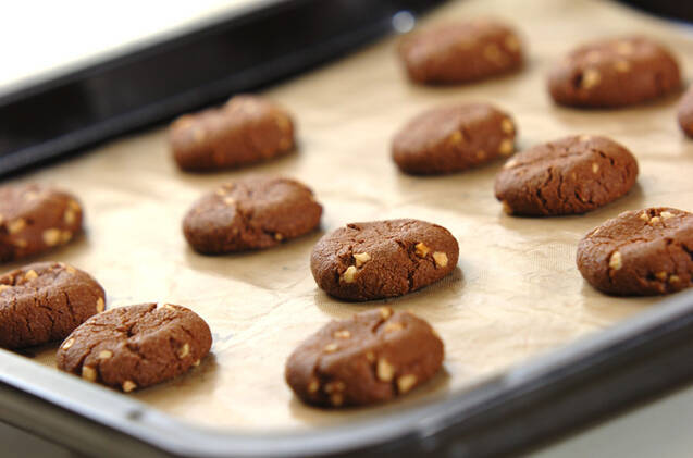 (3)を約10gずつ手で丸め、中央をへこませて天板にのせ、170℃のオーブンで12~13分焼いて取り出し、網にのせて冷ます。