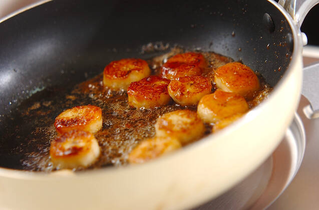 <バナナのキャラメリゼ>を作る。フライパンにグラニュー糖を入れ、火にかけ溶かす。無塩バターを加えて溶かし、バナナを加える。両面にカラメルがからまったら、ラム酒を加えてアルコール分を飛ばし、風味を残して焼く(フランベする)。