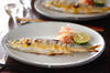 粗熱が取れた肝みそをアユの腹に戻し入れる。両面に軽く塩をして、グリルで両面に焼き色がつくまで焼く。皿に盛り、スダチと(1)のミョウガの汁気をきって添える。