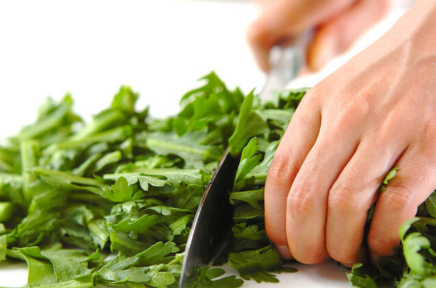 菊菜は軸の固い所を落とし、3cmの長さに切る。