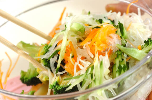 <ドレッシング>のボウルに(1)とキュウリとチリメンジャコを加えて和え、器に盛る。