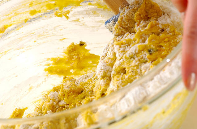 薄力粉を加えゴムベラで切るようにサックリ混ぜ合わせる。※ボウルを左手で時計と逆まわりにまわしながら、ゴムベラはボウルの淵に添わせながら時計まわりに滑らせると、練らずに混ぜられますよ!