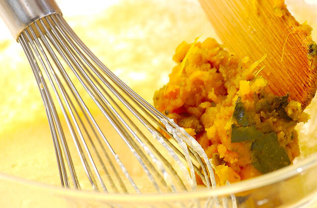 ふんわり白っぽくなったら、溶き卵を少しずつ加えながら混ぜ合わせ、ラム酒、レモン汁、カボチャ、アーモンドプードルも加え混ぜ合わせる。