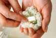 手を水で軽く湿らせ、塩少々をつけ1を手に取りカマンベールチーズを芯にして丸くまとめる。8~12個作る。