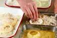 玉ネギに、小麦粉と合わせたカレー粉、溶き卵、パン粉の順につける。