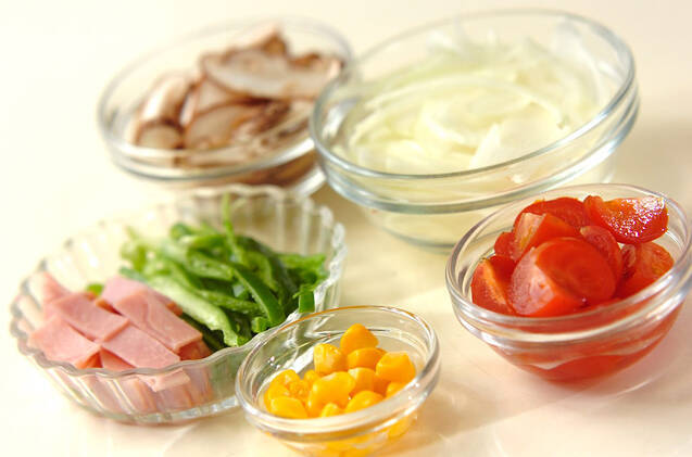 玉ネギは薄切りにして耐熱容器に入れ、ラップをして電子レンジに1分かける。シイタケは薄切りにし、ピーマンは縦半分に切って薄切りにする。ハムは3等分に切り、幅1cmに切る。プチトマトは4等分に切る。電子レンジは600Wを使用しています。