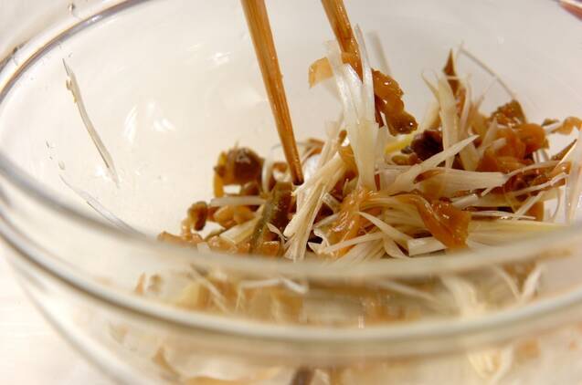 ニラは長さ3cmに切り、熱湯にサッと通し、ザルに上げて水気をきる。ザーサイと白ネギは細切りにし、先に混ぜ合せておく。