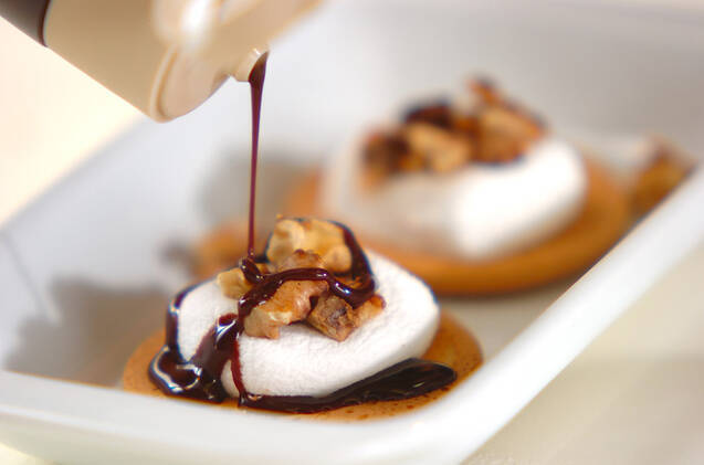 ビスケットにマシュマロをのせ、電子レンジで20~30秒加熱し、マシュマロが柔らかい間にクルミをのせ、チョコシロップをかける。ビスケットでサンドし、軽く押さえ、器に盛る。電子レンジは600Wを使用しています。