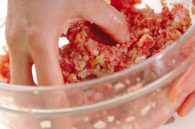 パン粉に牛乳をかけておく。玉ネギが冷めたら<タネ>の材料と混ぜ合わせる。<ソース>の材料を混ぜ合わせる。揚げ油を180℃に予熱し始める。